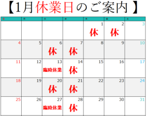都合により、1月は第2・4火曜日も臨時休業とさせていただきます。