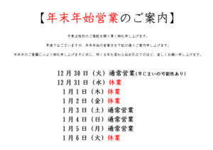 年内最終の営業:令和7年12月30日(火) 本来休業日ですが、営業いたします。